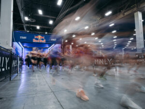 The warm-up zone had everything — treadmills, SkiErgs, sleds, wall balls. We practiced handoffs we probably should’ve practiced sooner, then lined up in the start tunnel while an MC counted us down.